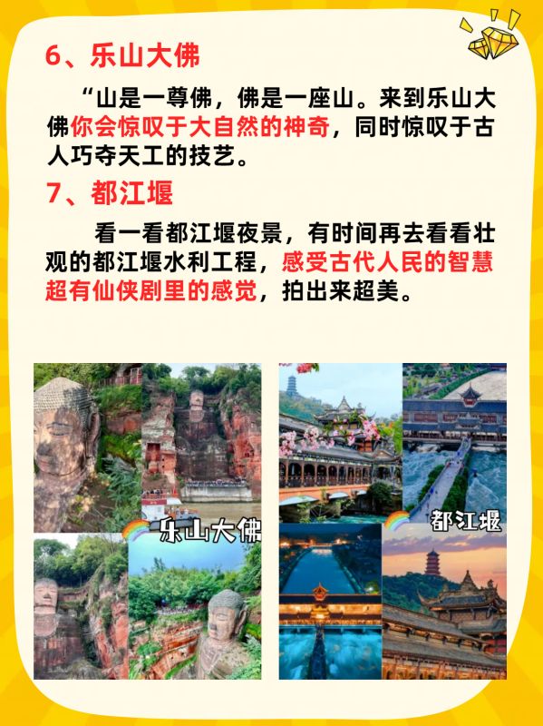 四川还有许多其他著名景点,如乐山大佛、都江堰等,每个景点都有其独特的魅力,我们可以根据自己的兴趣和偏好进行选择。