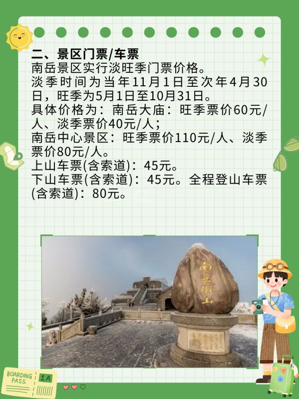 说明:南岳衡山中心景区、大庙景区实行淡旺季制。每年5月1日-10月31日是南岳衡山景区旅游的旺季时间,其它为淡季时间。全价门票的使用年龄为:18-59周岁。
