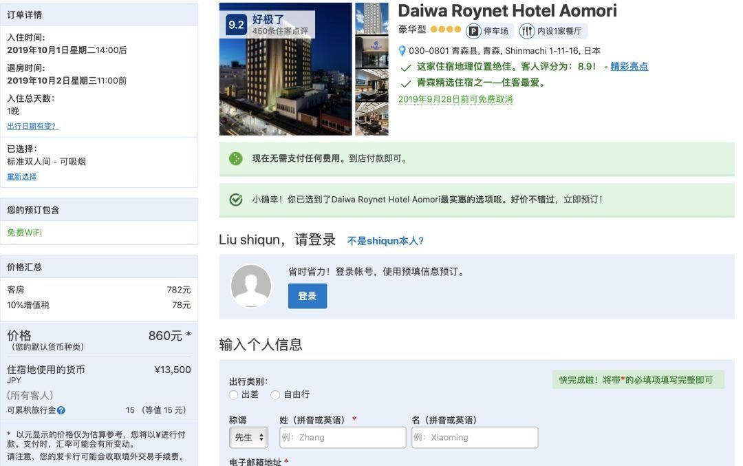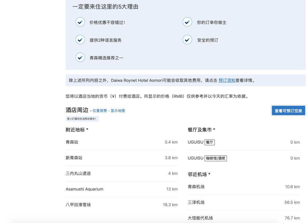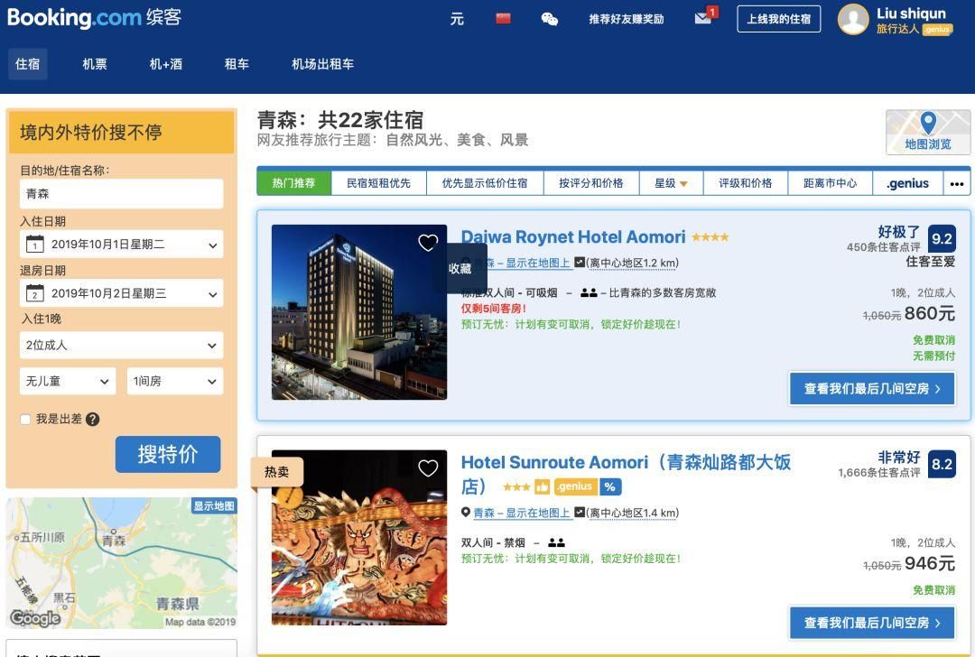 大家可以根据评分,价格,房间,酒店位置等因素选择自己心仪的酒店,不过Booking跟Agoda不同的是,价格已经包含了税和服务费,所以你看到的价格就是最终的价格了。以前Booking的价格还是挺便宜的,现在在价格方面已经没什么优势了,下面的预订流程我就以我们十一青森的酒店为例了。可以看到价格同样的酒店和房间跟Agoda相比要贵100多,不过每家肯定都有特色,多比较几家网站总能找到合适的价格。