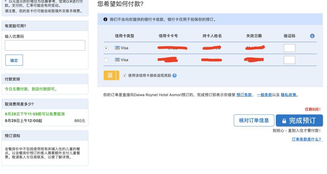 下面就是选择你希望的方式付款了,不过如果你的房间是支持现场付款的话,这里就是填上信用卡信息,网站做个担保而已,实际是不需要付钱的。如果你之前预定时候填过信息了,网站会直接帮你保存起来,下次就不需要输入了,很方便。