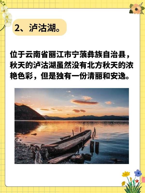 2、泸沽湖。秋天的泸沽湖虽然没有北方秋天的浓艳色彩,但是独有一份清丽和安逸。