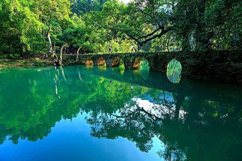 小七孔:秋冬时节,贵州省基本都变冷了,只有贵州南部的几个市县还保持着温暖,荔波是其中一个。冬季时候,游客减少,降雨减少,荔波樟江的水呈现蓝色,别有一番的美。荔波樟江风景名胜区由大、小七孔景区、水春河景区和樟江风光带组成。景区内以丰富多样的喀斯特地貌、秀丽奇特的樟江水景和繁盛茂密的原始森林、各类珍稀品种动植物为特色,集奇特的山水自然风光与当地布依族、水族、瑶族等民族特色于一身,是贵州首个世界自然遗产地。