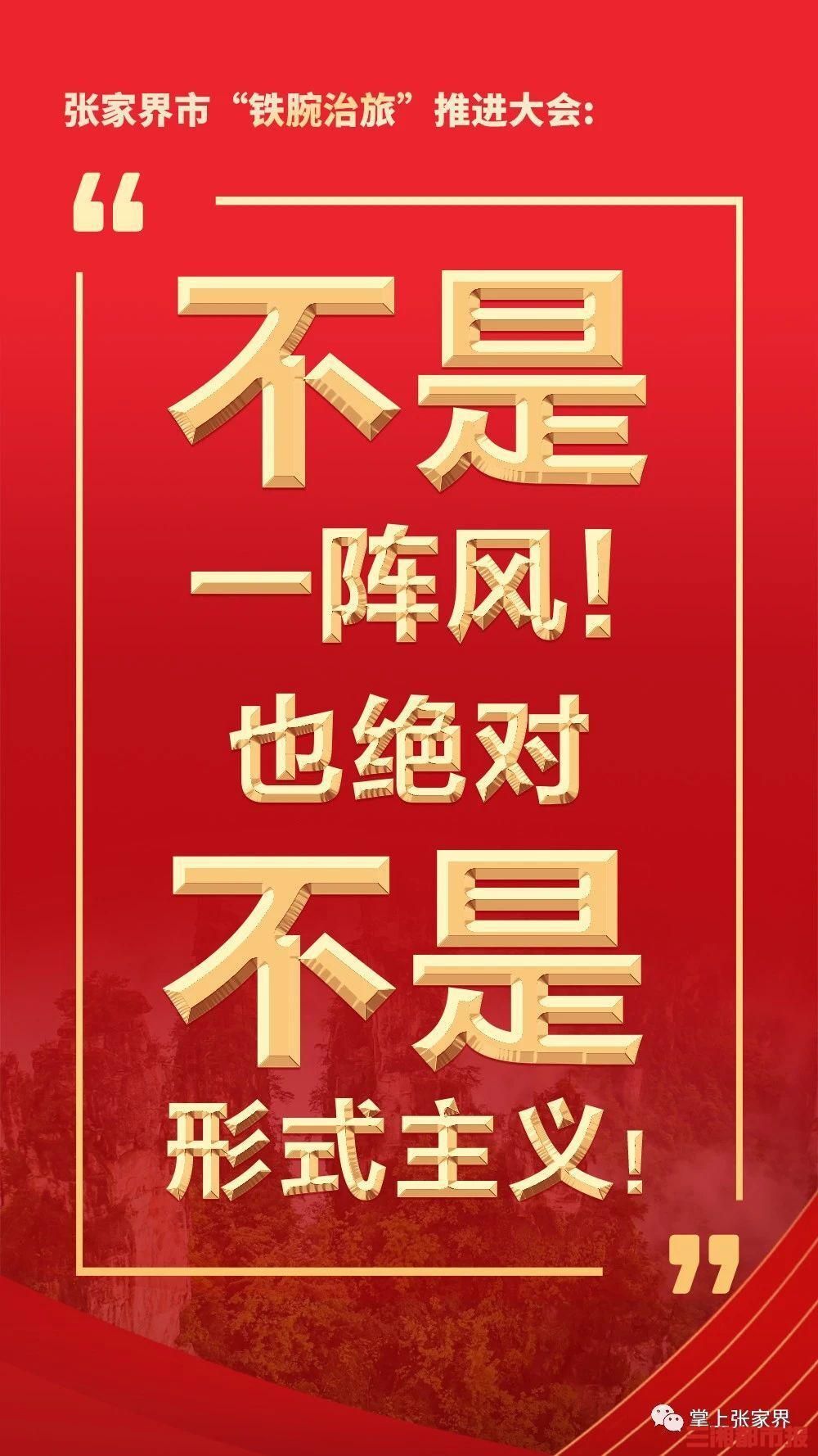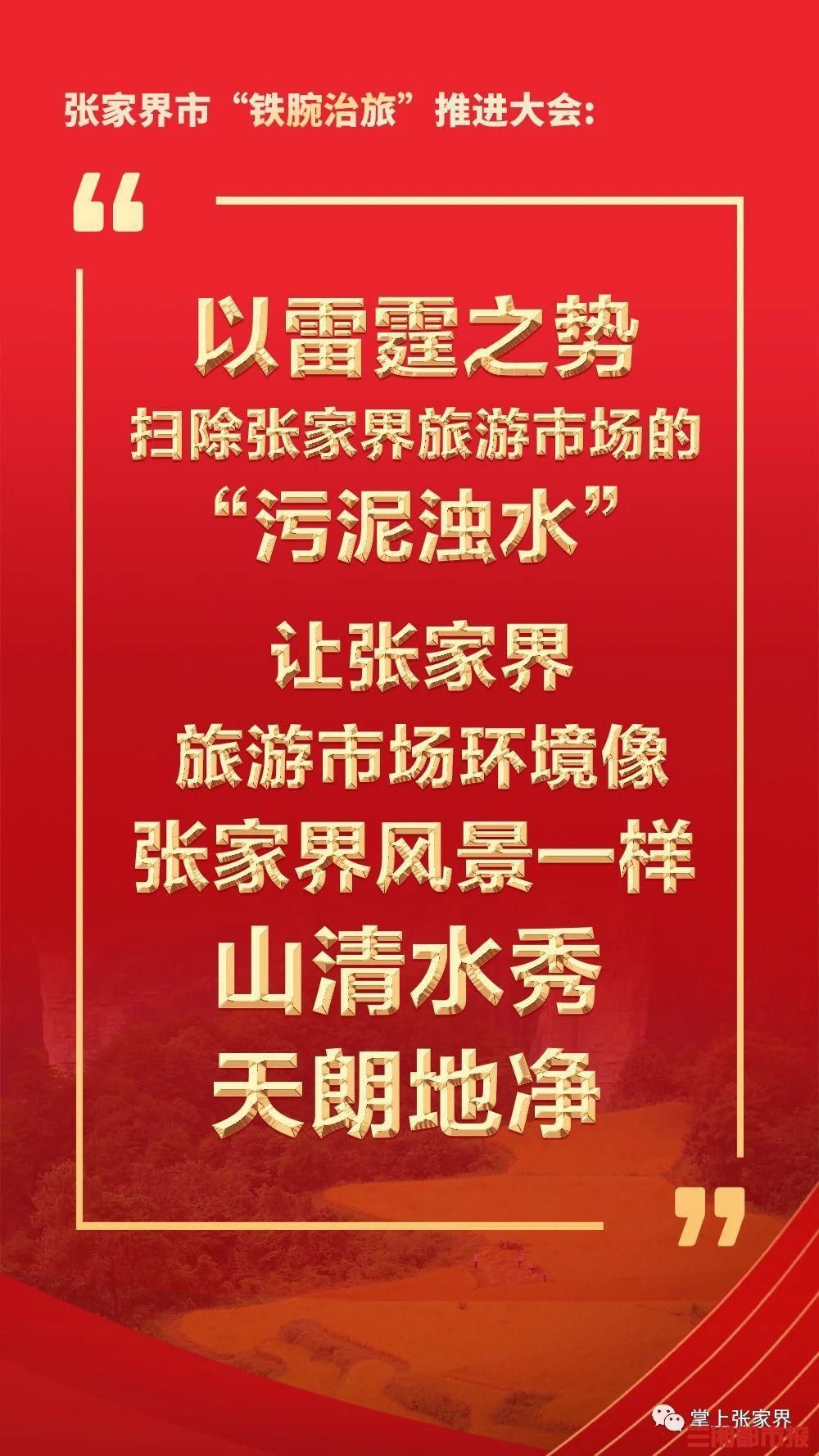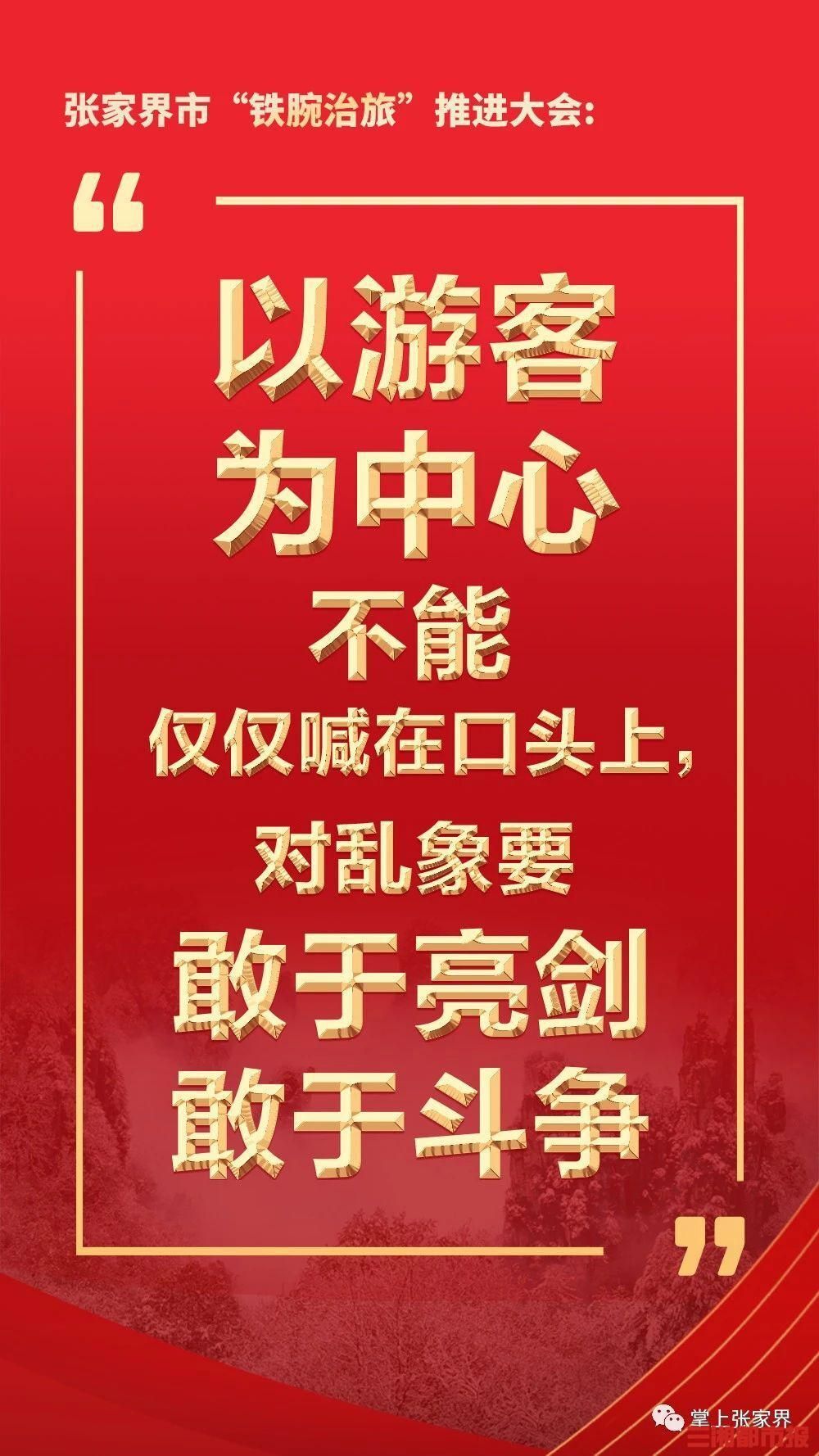 会议指出,推进“铁腕治旅”是落实以人民为中心发展思想的必然要求,是加快建设世界一流旅游目的地的必然要求,是张家界高质量发展、加快现代化建设的必然要求,是维护张家界35年来之不易“金字招牌”的必然要求,要认清形势,正视问题,充分认识推进“铁腕治旅”专项整治的必要性和紧迫性,清醒认识旅游市场乱象对张家界造成的危害,切实增强整治旅游市场乱象的责任感、紧迫感和危机感。