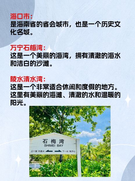 海口市:是海南省的省会城市,也是一个历史文化名城。这里有许多历史古迹和文化景点,如海口文庙、五公祠和东寨港古城等。此外,海口还有美丽的海滩和温泉,如西海岸和美兰湖温泉等。