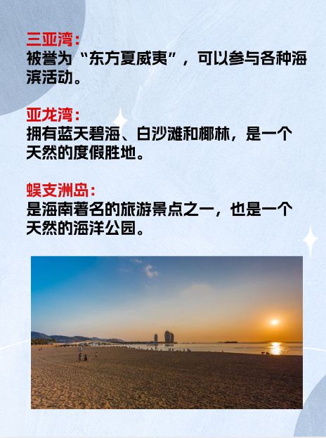 三亚湾:被誉为“东方夏威夷”,这里有白色的沙滩、清澈的海水、蓝天白云,是一个度假的好去处。可以参与各种海滨活动,如游泳、潜水、冲浪和沙滩排球。