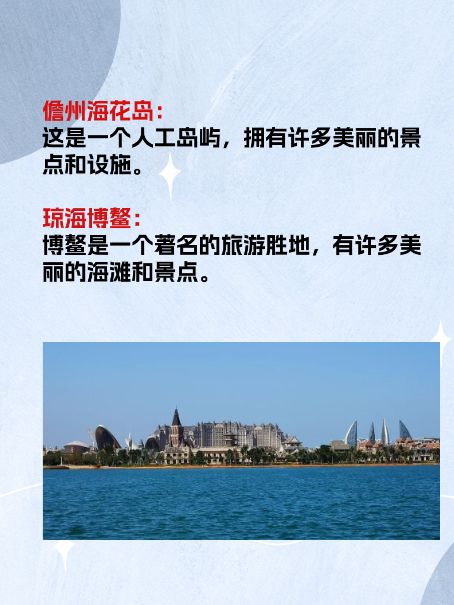 琼海博鳌:博鳌是一个著名的旅游胜地,有许多美丽的海滩和景点。这里还有许多美食和购物场所,是一个非常适合旅游和度假的地方。
