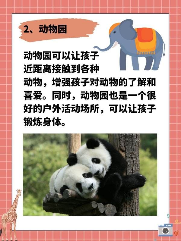 动物园可以让孩子近距离接触到各种动物,增强孩子对动物的了解和喜爱。同时,动物园也是一个很好的户外活动场所,可以让孩子锻炼身体。
