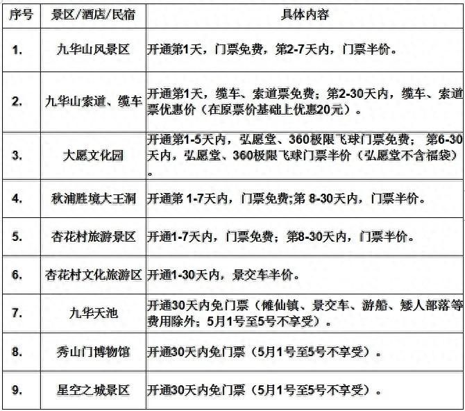 4月27日- 5月2日期间乘高铁到达“九华山站”的旅客,可凭有效电子车票信息记录或购票报销凭证、本人身份证到九华山游客服务中心6号售票窗口办理半价优惠门票。