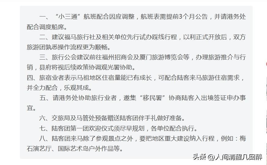 从第7条我们可以看到,马祖县已经是精心的做好了各种准备。特别的提到了,对于第1批来到马祖进行旅游的游客要举行欢迎仪式。那么第1次的欢迎仪式,绝对也是搞得非常隆重。同时也提到了各单位配合执行。那就充分的说明了马祖县在全力的配合着大陆过来的这些旅游团体,说明马祖县非常的重视这一次所争取到的成果。