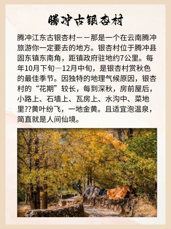 腾冲江东古银杏村--那是一个在云南腾冲旅游你一定要去的地方。银杏村位于腾冲县固东镇东南角,距镇政府驻地约7公里。每年10月下旬—12月中旬,是银杏村赏秋色的最佳季节。因独特的地理气候原因,银杏村的“花期”较长,每到深秋,房前屋后,小路上、石墙上、瓦房上、水沟中、菜地里??黄叶纷飞,一地金黄。且适宜泡温泉,简直就是人间仙境。