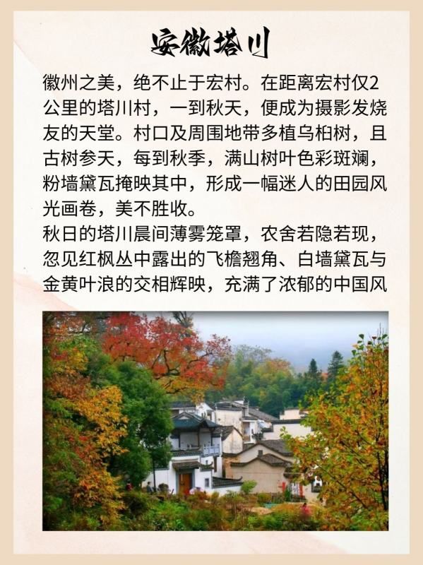 徽州之美,绝不止于宏村。在距离宏村仅2公里的塔川村,一到秋天,便成为摄影发烧友的天堂。村口及周围地带多植乌桕树,且古树参天,每到秋季,满山树叶色彩斑斓,粉墙黛瓦掩映其中,形成一幅迷人的田园风光画卷,美不胜收。