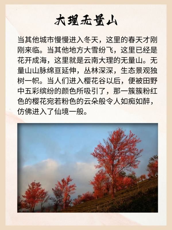 当其他城市慢慢进入冬天,这里的春天才刚刚来临。当其他地方大雪纷飞,这里已经是花开成海,这里就是云南大理的无量山。无量山山脉绵亘延伸,丛林深深,生态景观独树一帜。当人们进入樱花谷以后,便被田野中五彩缤纷的颜色所吸引了,那一簇簇粉红色的樱花宛若粉色的云朵般令人如痴如醉,仿佛进入了仙境一般。