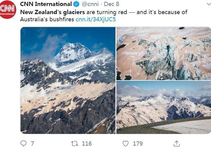 这并不是新西兰的冰川第一次被染成粉色,而冰川粉红色的"外套"也并非是大自然的杰作。在这个季节,森林大火带来了这种奇观,燃烧过的红色尘埃和泥土随着气势浩荡的烟雾飘来,附着在冰川之上。