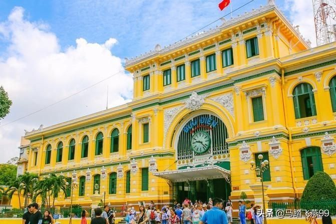 胡志明市中央邮局,建于19世纪末,由法国建筑师设计,大厅内部装饰华丽,圆顶极富古典气息。宽阔的大厅两侧是业务办理柜台,中部由外到内依次是环形长椅、纪念品柜台和长写字桌,胡志明在大厅尽头慈祥地俯视着成群的外国游客,他们在大厅里拍照、发呆或是拿着一大叠明信片奋笔疾书。