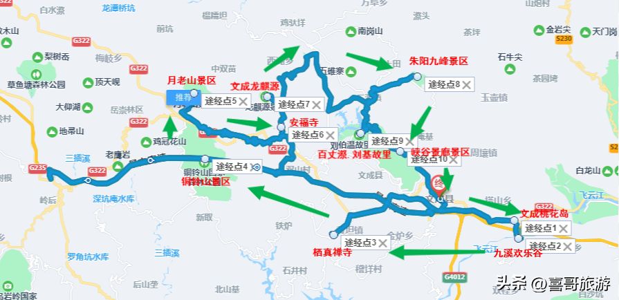 2、推荐文成县景点自驾游行程路线:文成县-文成樱花岛-九溪欢乐谷-栖真禅寺-铜铃山景区-月老山景区-安福寺-文成龙麒源-朱阳九峰景区-百丈漈.刘基故里-峡谷景廊景区-文成县。