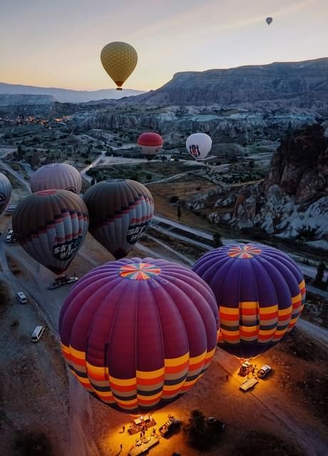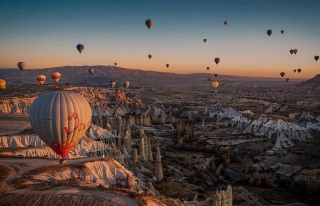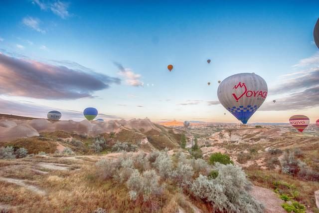 7、如果一次热气球之旅还无法尽兴,别忘了棉花堡还有一处被称为"热气球谷"的特殊地形。在这片区域内,热气球公司会为游客提供另一种独特的浪漫体验——近距离与众多低空飞行的热气球同舞,亲手触摸到那火热的球囊。对于情侣或家庭出游的朋友来说,这绝对是一个创造浪漫美好回忆的绝佳机会。