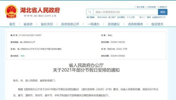 根据《国务院办公厅关于2021年部分节假日安排的通知》(国办发明电〔2020〕27号)要求,经省人民政府同意,现将2021年元旦、春节、清明节、劳动节、端午节、中秋节和国庆节放假调休日期的具体安排通知如下。