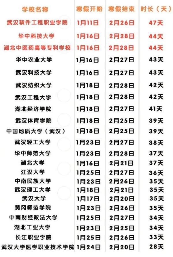 湖北部分高校放假时间也出炉啦!最早开启寒假生活的是武汉软件工程职业学院,并且拥有最长假期47天,其次是华中科技大学、湖北中医药高等专科学校,有44天假期。