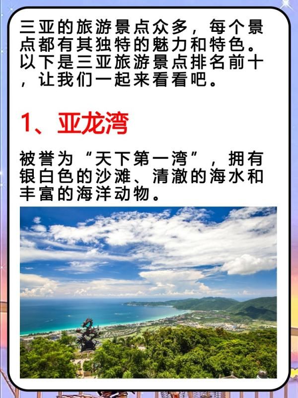 三亚的旅游景点众多,每个景点都有其独特的魅力和特色。以下是三亚旅游景点排名前十,让我们一起来看看吧。