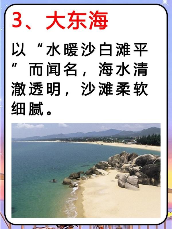 3、大东海以“水暖沙白滩平”而闻名,海水清澈透明,沙滩柔软细腻。