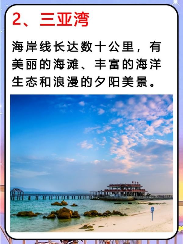6、椰梦长廊海棠湾:是三亚最美的海湾之一,拥有不同种类的海滩和热带植物,是旅游度假胜地。
