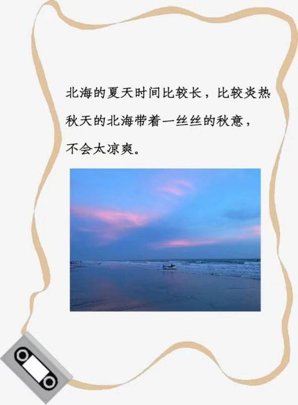 北海作为一个典型的亚热带地区,这里的夏天时间比较长,一年当中可能会有7-8个月的夏季,带给人们的无限的炎热。建议选择秋天,也就是每年的10-11月份的时间前往北海,此时的北海带着一丝丝的秋意,却又不会太凉爽。