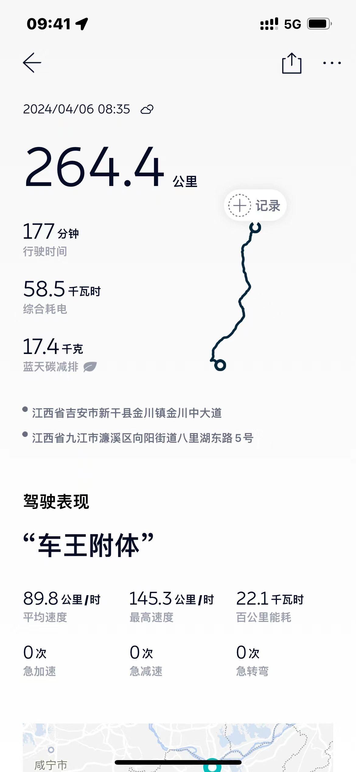 那次是从吉安出发到九江,总共花了3小时不到。蔚来的换电站高速简直无敌,因为出门没充满电,在高速上换了个电,3分钟直接满血复活,如果满电出发,根本就不需要补能,到九江应该还有80公里左右续航。