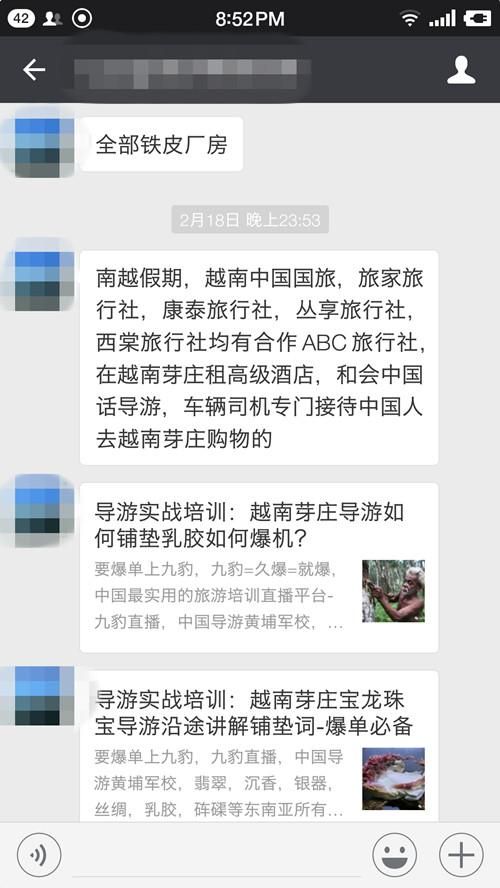 微信公众号“九豹直播商城”收费向中国导游传授增加游客在购物店消费经验。里面的“知名讲师”李某同时也是越南芽庄珠宝、乳胶垫购物店的经理。通过暗访,界面新闻新闻记者了解到,在越南做乳胶购物店和翡翠购物店,分别能实现10倍和30倍的利润。