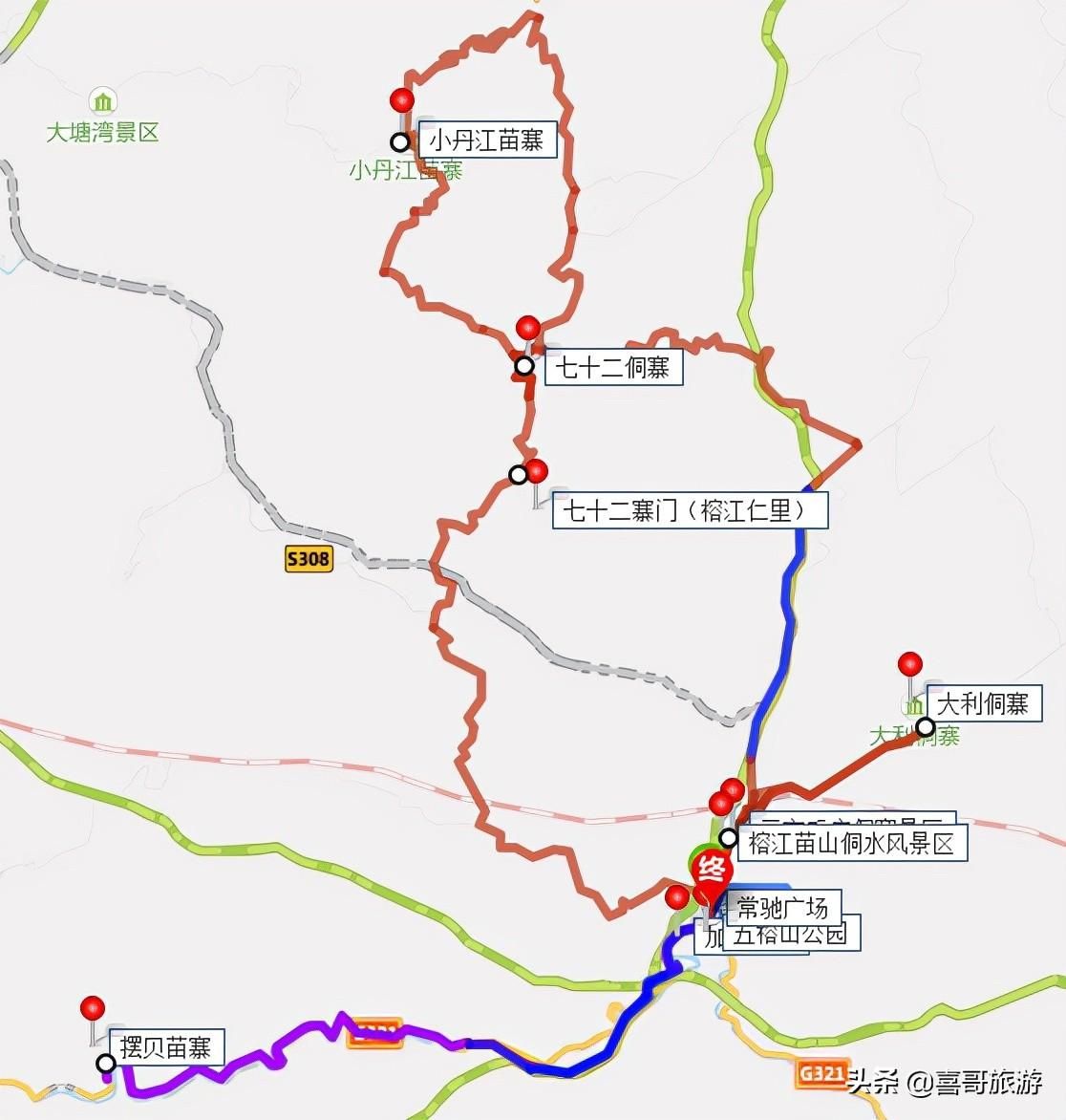 自驾游交通路线:榕江县-榕江县城区-308国道-老街路-兴仁大道-七十二寨门(榕江仁里)。全长57.8公里,车程1小时16分钟。