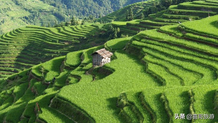加榜梯田,位于贵州省黔东南苗族侗族自治州榕江县加车村。梯田中散落着苗乡特有的吊脚楼。是苗族人世世代代留下的杰作。苗族是“稻饭鱼羹”的民族。