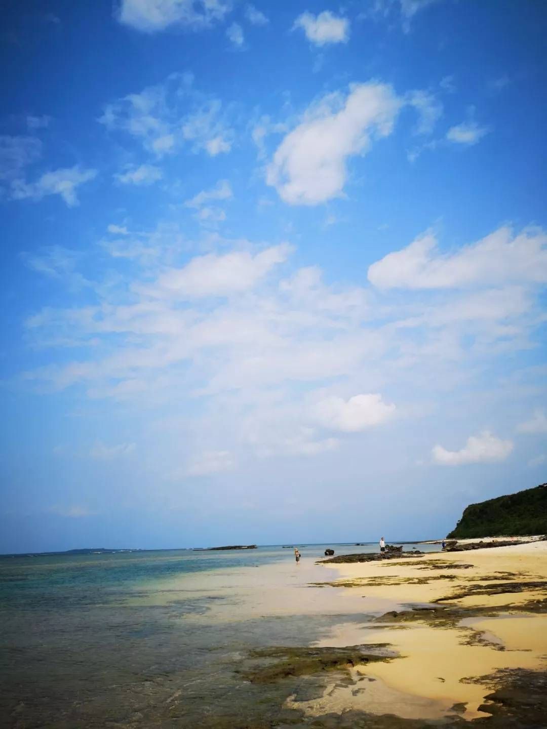 握手告别后,按照他们的指点,从一条小路下行到海滩,哇,好一片蓝。
