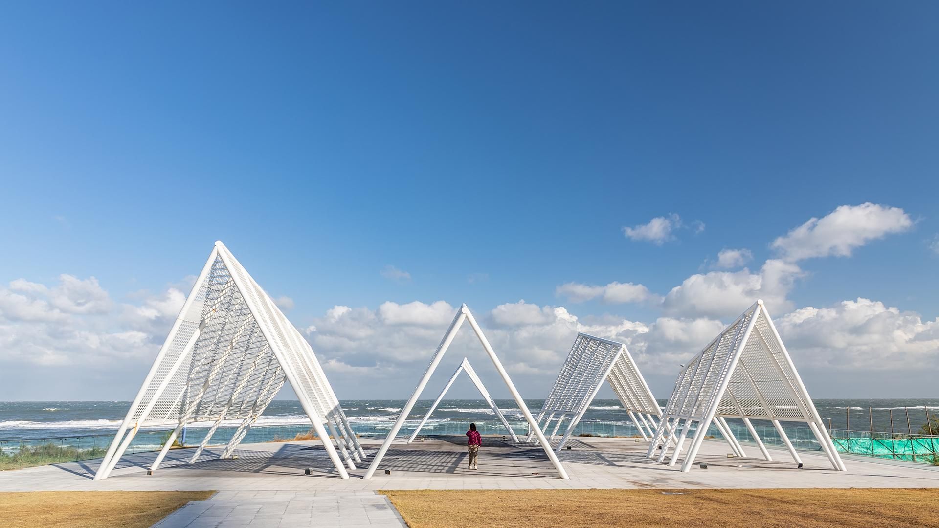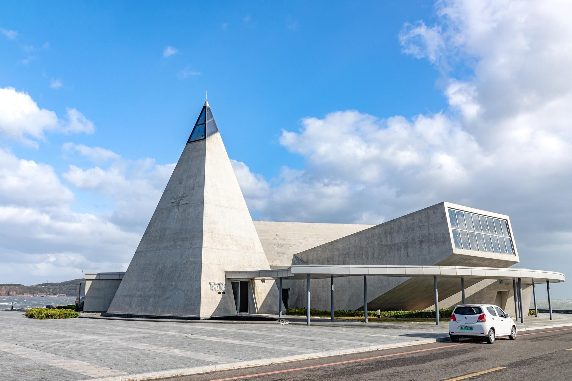 海角艺术馆,连同附近的几幢建筑都是几何形的,很抓眼球。